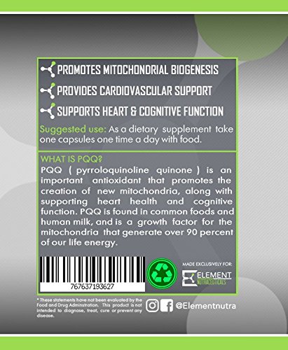 -. Binding : Health and Beauty -. Brand : Element Nutraceuticals -. EAN : 0767637193627 -. Feature : PQQ stimulates growth and serves as a cofactor for a special class of enzymes involved in cellular function including cellular growth, development, differentiation, and survival / PQQ is also as an extremely powerful antioxidant capable of catalyzing continuous cycling (the ability to perform repeated oxidation and reduction reactions) to a much greater degree compared to other antioxidants / PQQ is able to carry out 20,000 catalytic conversions compared to only 4 for vitamin C -. IsAdultProduct : 0 -. Label : Element Nutraceuticals -. Manufacturer : Element Nutraceuticals -. MPN : ENPQQ -. PackageQuantity : 1 -. PartNumber : ENPQQ -. ProductGroup : Health and Beauty -. ProductTypeName : HEALTH_PERSONAL_CARE -. Publisher : Element Nutraceuticals -. Studio : Element Nutraceuticals -. Title : PQQ- PYRROLOQUINOLINE QUINONE - (75 ct x 20mg) by Element Nutraceuticals - Supports Heart and Healthy Mitochondrial Fuction -. UPC : 767637193627