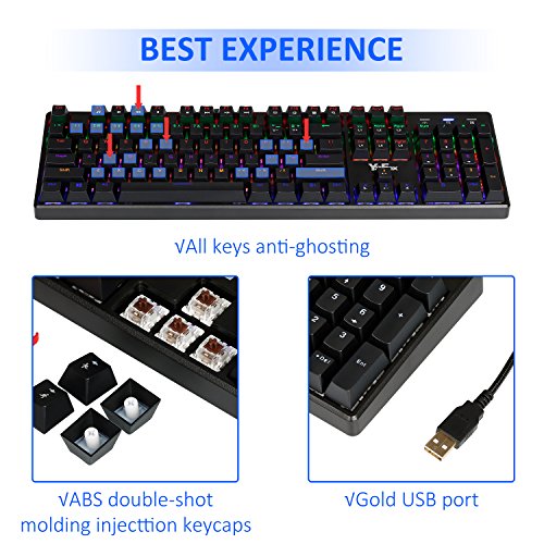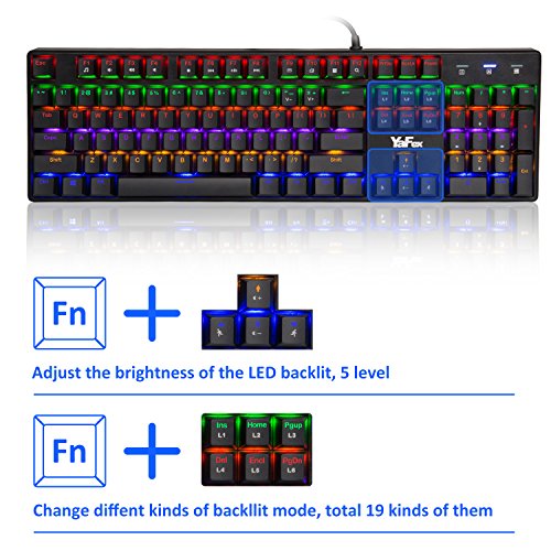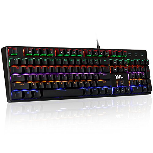 YaFex Mechanical Keyboard 104-Key Rainbow Backlit Anti-Ghost Wired Gaming Keyboard with Durable ABS Black Keycaps 104-Key Mechanical Gaming Keyboard The YaFex 104-keys mechanical keyboard is accessible for office workers, gamers, and more. These switches have the highest quality, offering a life span of over 50 million operations and feature gold plated contacts.Perfect fit for typing and gaming.