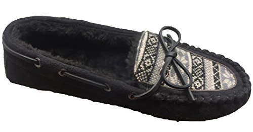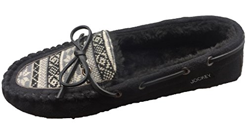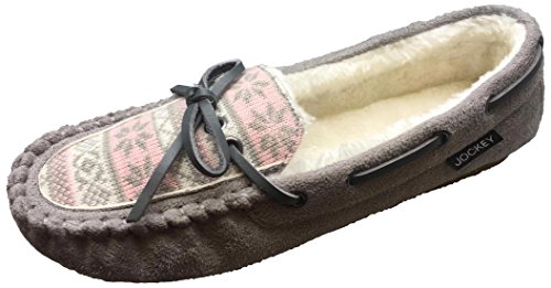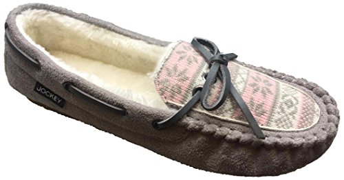 Product DescriptionJockey Women's moccasin slippers feature faux suede throughout with snowflake pattern. Easy slip on design and non skid rubber sole. Imported.0