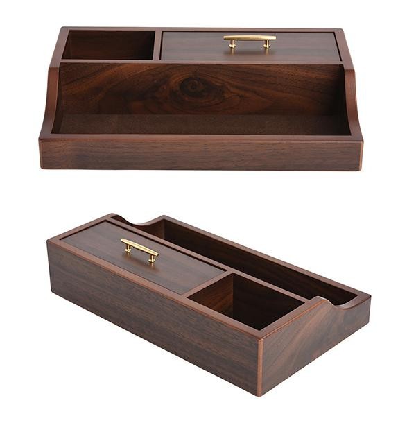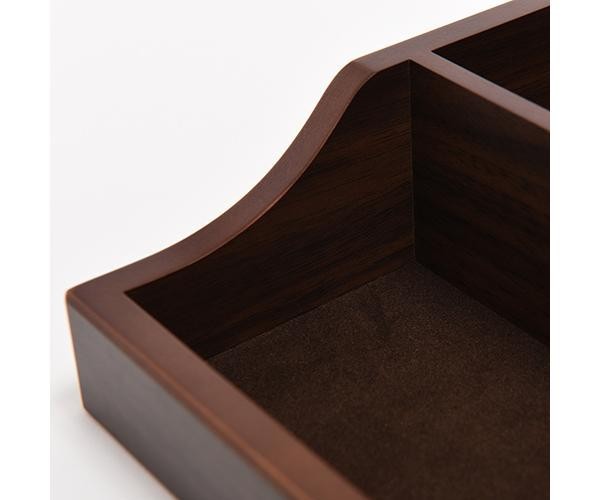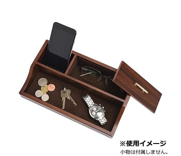 | 大人の男性に向けた機能的でシックなスタンダード収納アイテム。スマホや時計、メガネといった普段持ち歩く小物たちは、帰宅後このオーバーナイターへ。木目が美しい落ち着いた佇まいも素敵です。 |
