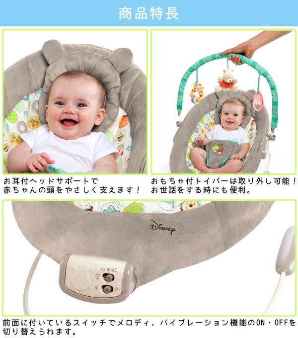 ふわふわで座り心地抜群!!人気の『くまのプーさん』バウンサー。ヘッドサポートもプーさん型!キュートな仲間たちがプリントされたシートが赤ちゃんをやさしく包みます。7つのオリジナルメロディと心地良いバイブレーション機能を搭載。 |