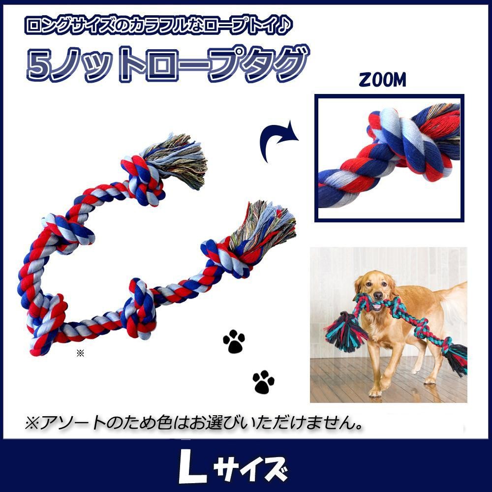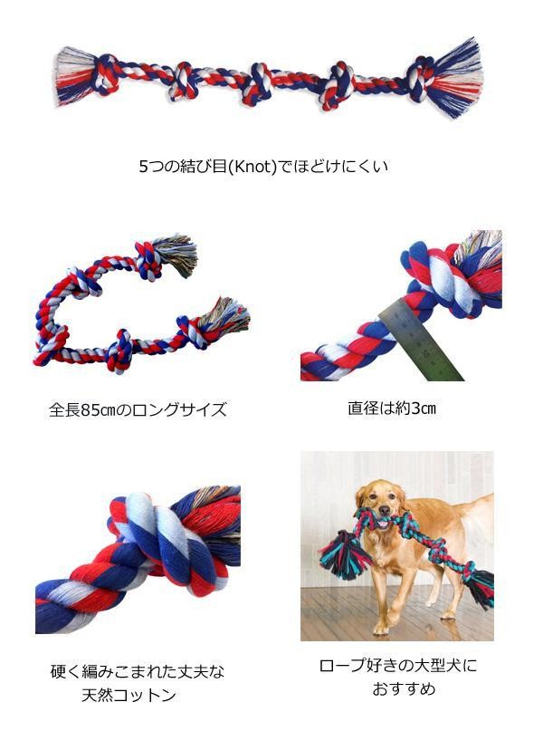 | 5つの結び目(Knot)でほどけにくいロングサイズのカラフルなロープトイ。3色の色鮮やかな100%天然コットンが硬く編みこまれ、十分な強度もあり見た目も華やか。いつもの引っぱりっこ遊びがさらに楽しくなります。 |
