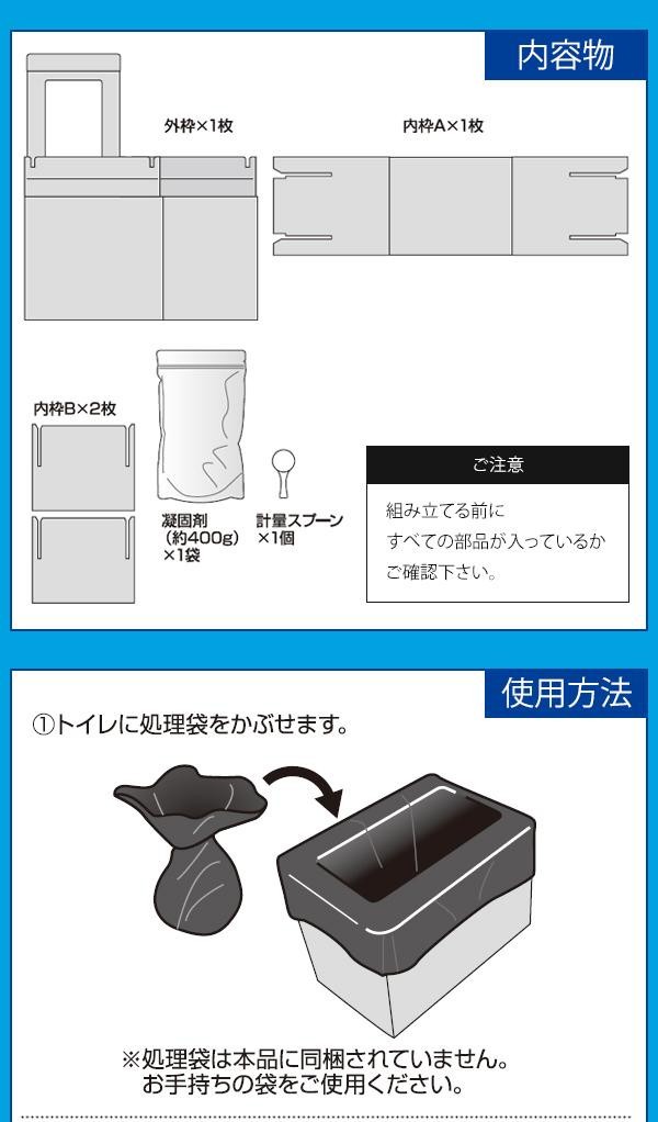 | セット内容 | トイレ本体(組立式)×1個、凝固剤(400g)×1袋、計量スプーン×1個、取扱説明書 |