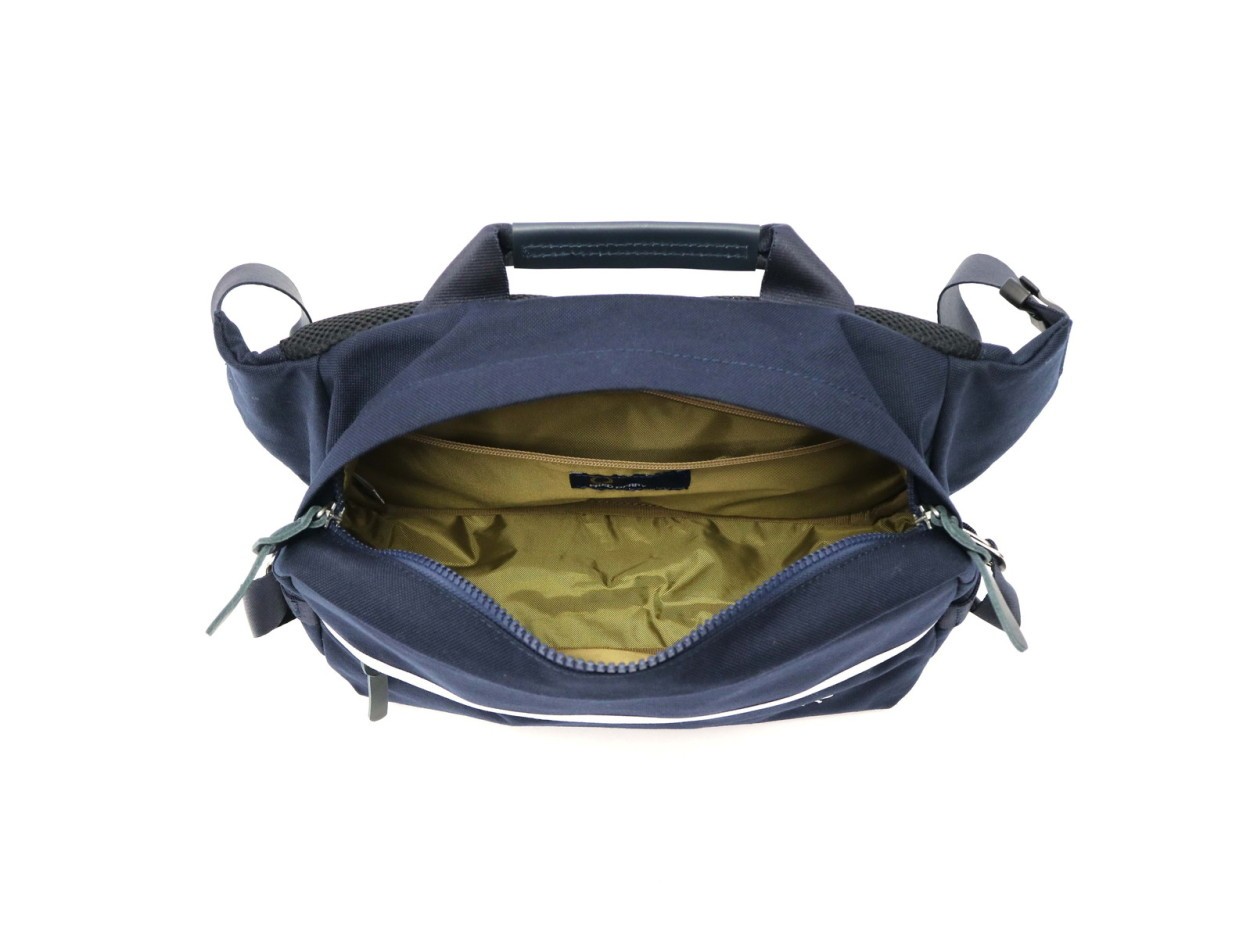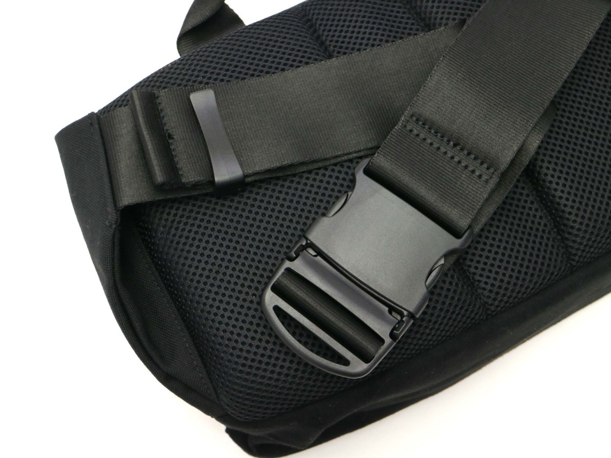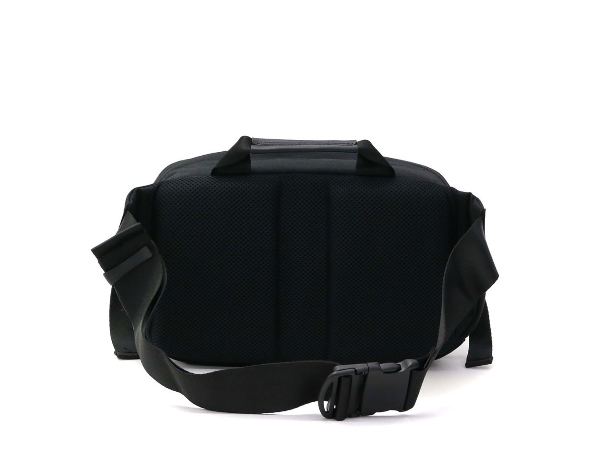1000Dのナイロンファブリックを使用したウエストバッグです。サイド部分のアジャスターテープによって内容量に応じてサイズを調節可能。常にぴったりなサイズ感でお使いいただけます。