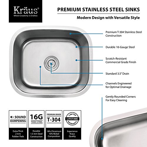 Kraus KBU11 20 inch Undermount Single Bowl 16 gauge Stainless Steel Kitchen Sink