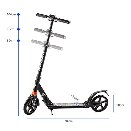 -. Feature : Rubber handles, anti-slip, safe to grip. Foldable structure for minimizing the size to stay in a corner or in a bag. / Adjustable height with three levels (86cm, 96cm and 104cm) with wider applications for different groups of people. / Scooter equipped with a locking system, which makes the vehicle more stable. The brake and mudguard system are combined in one piece, more convenient and safe to ride on damp roads. / Maximum load: approx.100 kg. Adjustable Height: approx.86cm, 96cm and 104cm/ 33.9", 37.8" and 40.9". / Diameter of the wheel: approx.20cm/7.9". Total Length: approx.94 cm/37".