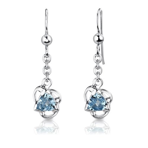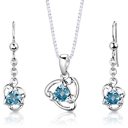 Earrings = Genuine Swiss Blue Topaz, 2 pieces, Trillion cut, 5mm. Earring Dimensions: 1 1/8 x 1/4 inches. Pendant = Genuine Swiss Blue Topaz, 1 piece, Trillion cut, 6mm. Pendant Dimensions: 3/4 x 3/8 inches. Earrings and Pendant have a total weight of 3.10 grams and are set in pure Sterling Silver Rhodium Finish with .925 stamp. Gemstones have a vibrant rich color and eye clean clarity. The Pendant and Earrings feature top quality workmanship and a beautiful finish. Includes Free 18 inch Sterling Silver Rhodium Finish Box Style Chain, Free Ribbon Gift Box.Feature