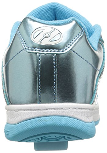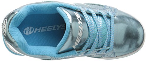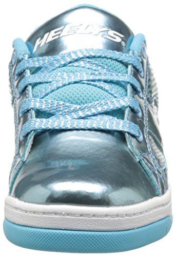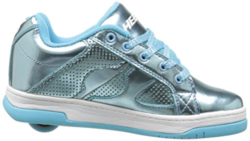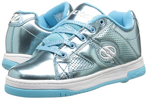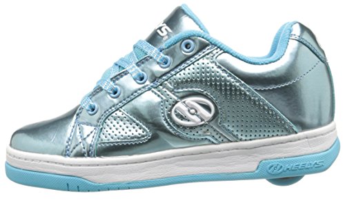 Lo-top silhouette with a wide skate body. Chrome-tinted Synthetic patent leather upper. Full lace-up closure for a snug, adjustable fit. Padded collar and tongue for added comfort and support. Heelys® logo at sides, heel, and tongue. Heelys Wave Comfort Heel Bracket provides comfort and stability. Matched molded tongue logo. Faux vulcanized cupsole with rubber outsole. Abrasion-resistant brake pad. ABEC 1 Bearings/ FATS low profile wheel.