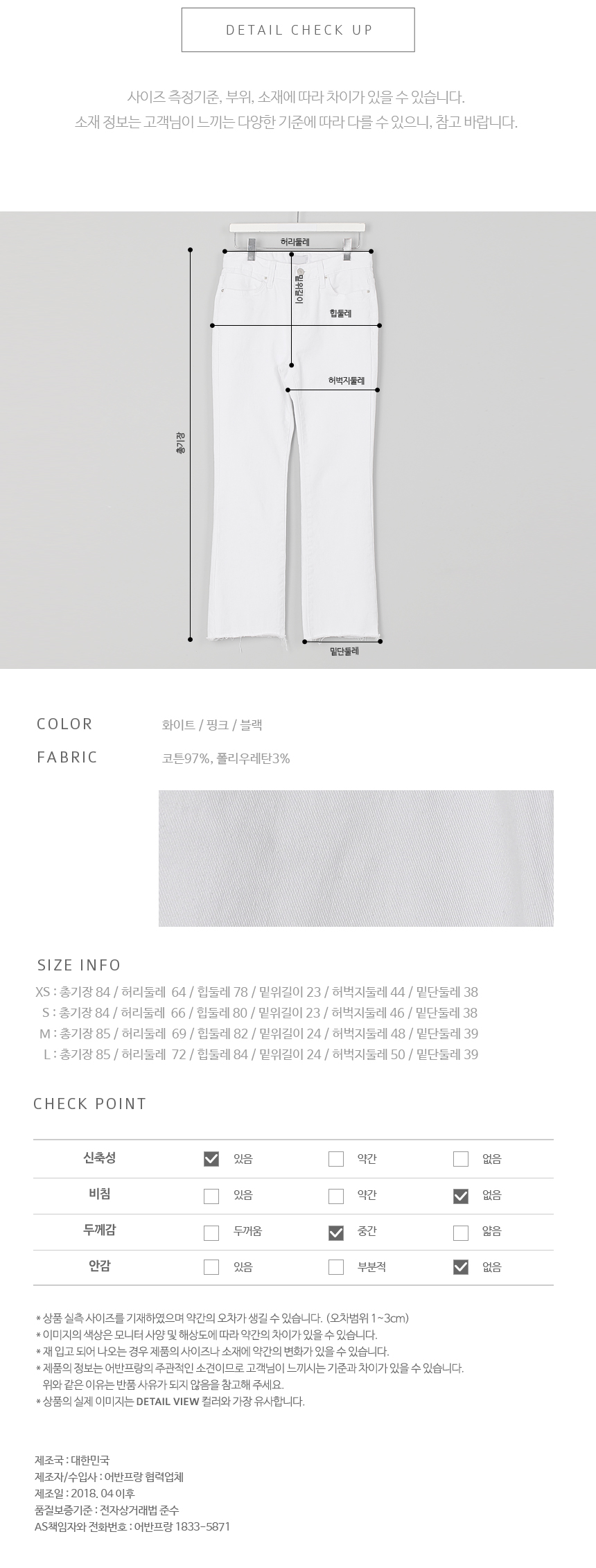 탄탄하게 바디라인을 잡아주면서도텐션이 좋아 불편하지 않은산뜻한 길이감의 부츠컷 팬츠에요두께감이 얇고 가벼워여름시즌까지 입기 좋답니다자연스럽게 컷팅된 밑단이 깔끔해요허리 26 S사이즈의 모델이(힙,골반 큰편)S사이즈 잘 맞게 입어주었어요색상은 화이트, 핑크, 블랙사이즈는 XS,S,M,L▼ 관련상품 : 화사한 나그랑 언발 티셔츠아트 프릴 코튼 블라우스스타일 롱 트임 원피스스트라이프 배색 썸머니트