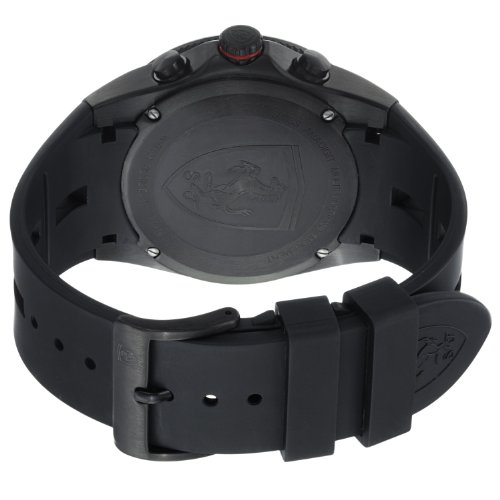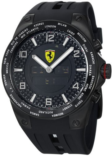 -. Feature : Black PVD coated stainless steel case (45 mm in diameter, 15 mm thick), Screw-in case-back engraved with the Ferrari emblem, Bezel displays 24 time zone cities / Black carbon fiber dial with black center and digital display, Silver-tone luminescent hands, Silver-tone indices and Arabic numerals / Digital display features the weekday and date, 24 hour time, 2nd time zone with city code, alarm, 1/100 of a second chronograph, and timer / Anti-glare mineral crystal, Swiss quartz anadigit multifunctions movement, ISA caliber 9013 / Water resistant to 5 ATM/50 meters/165 feet, Black rubber strap, Pin buckle