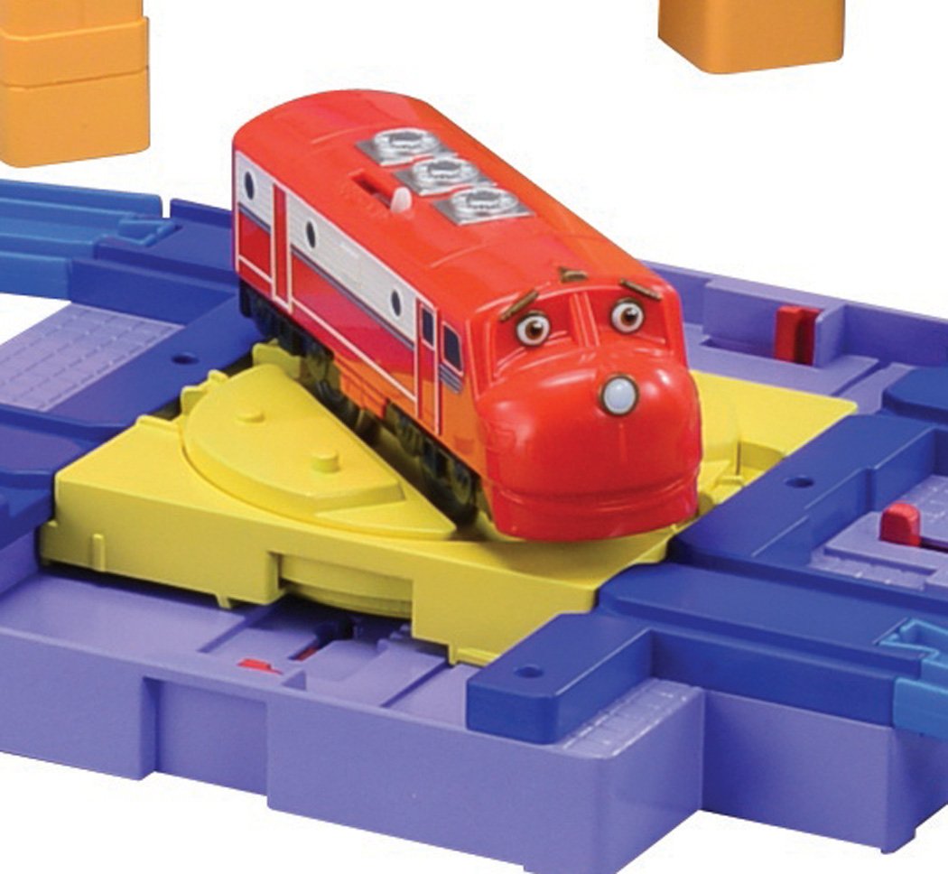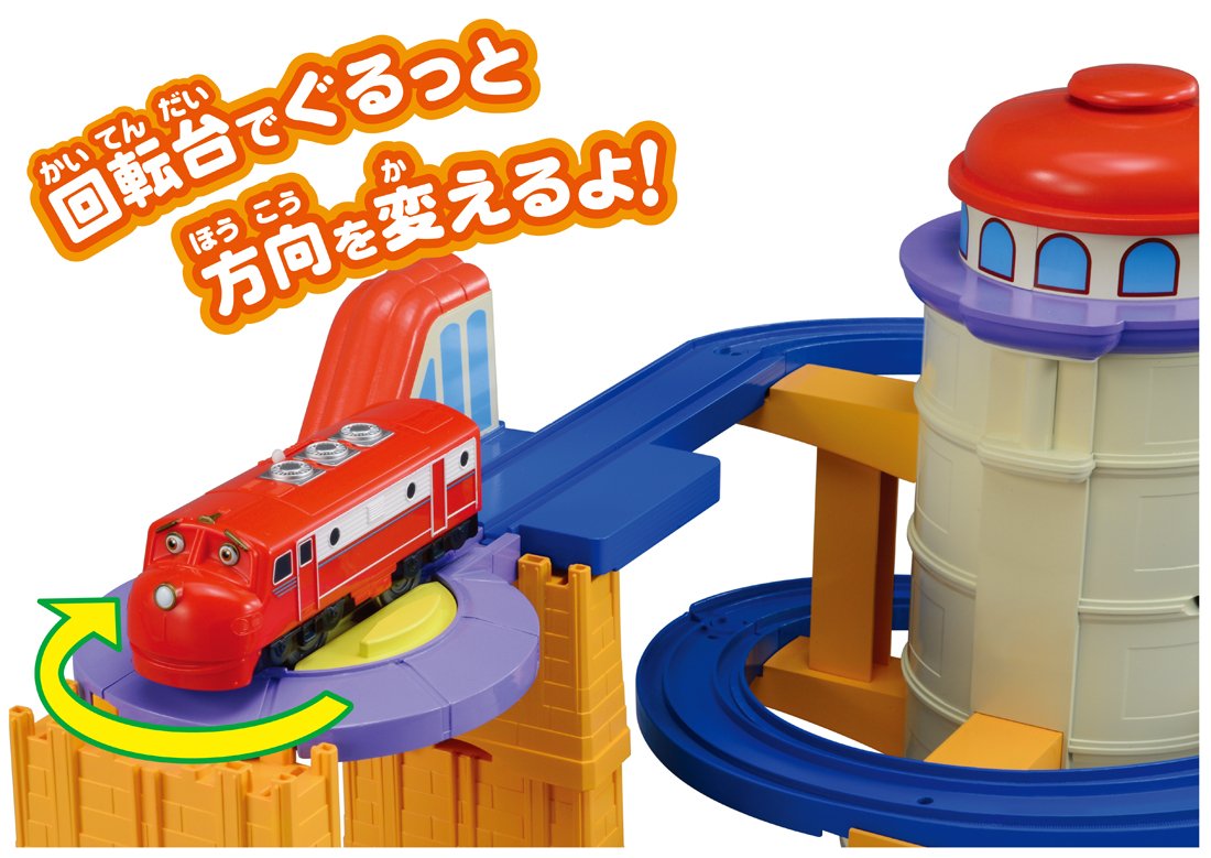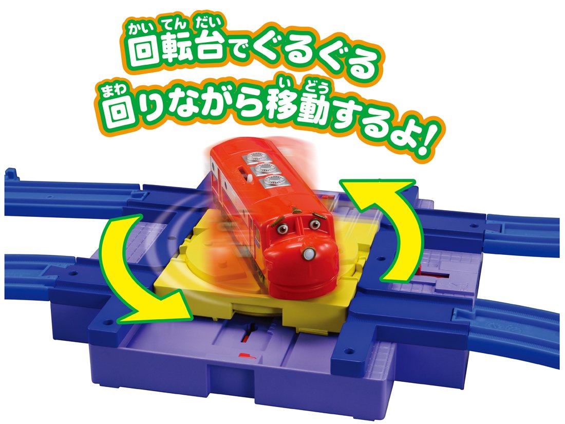 When pulling the lever of the moving rotating table in the center, Wilson moves around to the next rail while turning around.