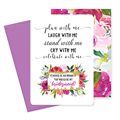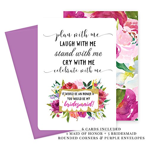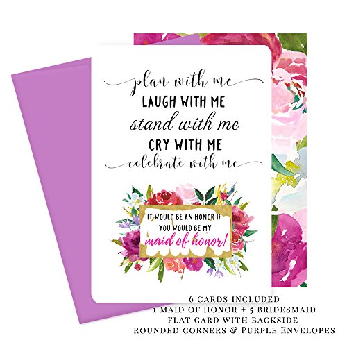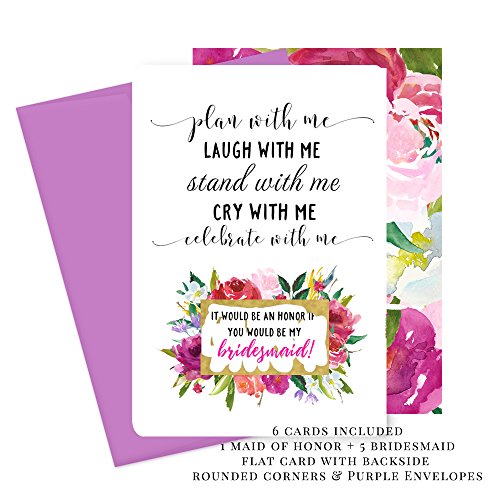 Studio : Paper Clever Party Publisher : Paper Clever Party Binding : Office Product Product Description What better way to ask your best girls to be part of your wedding celebration? This gorgeous floral bridesmaid card set is sure to add some fun to the question. Scratch off bridesmaid cards are printed on high quality super smooth flat card-stock with rounded corners and a bold floral design on the front and backside, complete with a mix of calligraphy and serif scripts. Each card set includes six total cards, paired with premium purple envelopes for mailing or giving to your bridesmaids and maid of honor. The backside of each flat card is a gorgeous vibrant flower to complete the unique card look. Front of the flat card reads 'plan with me, laugh with me, stand with me, celebrate with me' and under the scratch off seal the wording is 'it would be an honor if you would my...' hand these cards out during a special lunch with your girls or send via mail as a surprise. Your bridal party is going to LOVE the scratch off activity card that pops the question. Additionally, you can also attach these beautiful bridesmaid cards to a gift basket for the bride tribe, a stylish must have stationery set for the bride to be. 0
