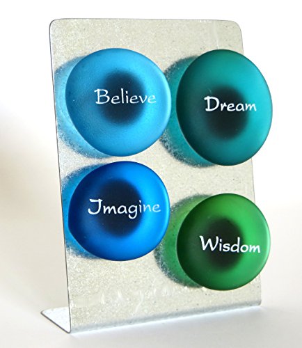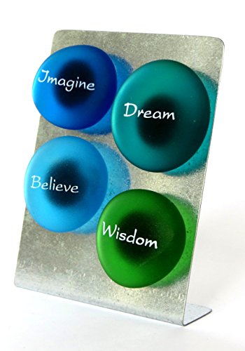 Four Mermaid's Message Magnets on a Steel Stand: Inspiring Words on Frosted Sea Glass Magnets. By Lifeforce Glass. Set I