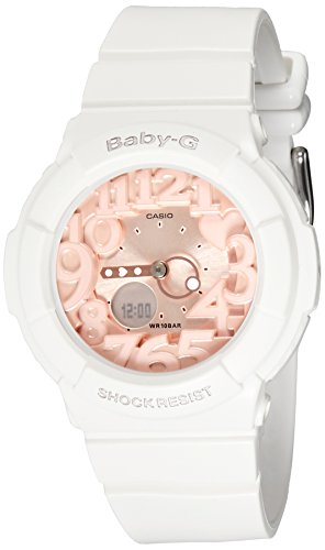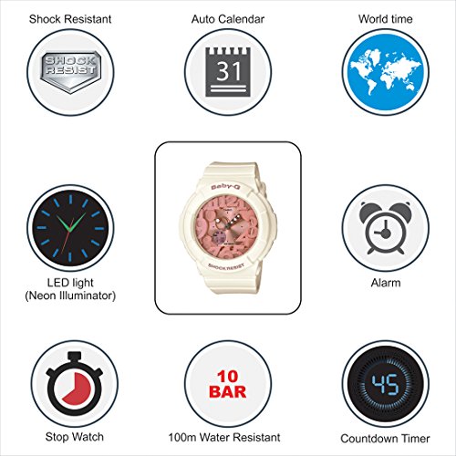 Brand, Seller, or Collection Name:Casio Model number:BGA-131-7B2DR (B154) Part Number:BGA-131-7B2DR (B154) Model Year:2016 Item Shape:ROUND Dial window material type:Mineral Display Type:ANALOG DIGITAL Case material:Plastic Case diameter:26 millimeters Case Thickness:15 Band Material:Resin Band width:16 millimeters Band Color:White Dial color:Pink Calendar:Yes Special features:water resist Item weight:7.36 Ounces Movement:Quartz Water resistant depth:100 Meters
