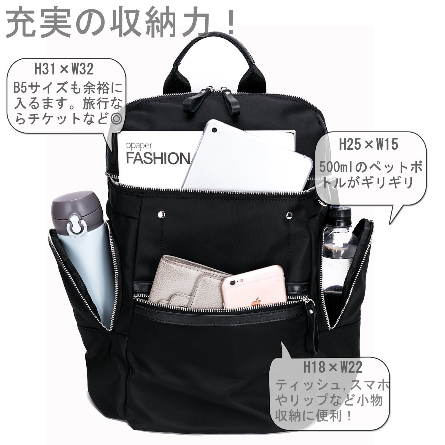 · Equipped with pockets that can store folding umbrellas and PET bottles on both sides