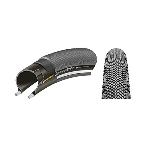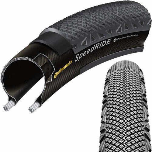 Studio : Continental Publisher : Continental Product Description The Speed RIDE is the specialist for fast riding on harder surfaces. Whether asphalt, gravel or forest paths, thanks to the diamond-coated tread, the tyre rolls off quickly and quietly. Its shoulder lugs give the necessary grip in cornering and with a folding bead version, all important weight is reduced further on the sporty ?cross commuter bike'. Optional reflective strips for more safety. Continental Puncture ProTection supplies adequate resistance to flats. 0
