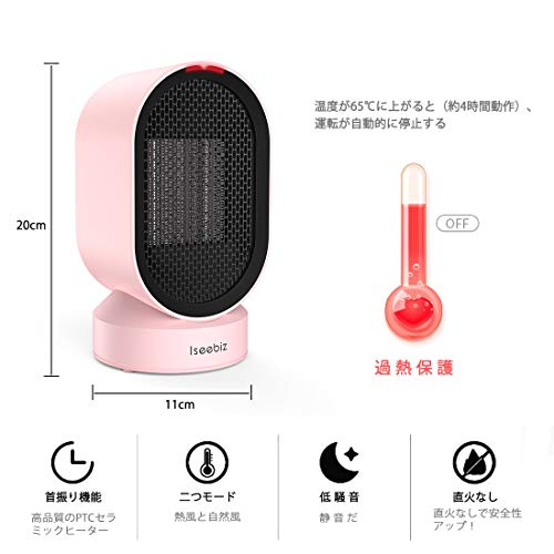 【**2秒でぽかぽか**】 本製品の発熱体はPTCセラミックを採用して、電熱転換率は高いです。節電ばかりではなく、ガスやオイルなどの燃料を使用しません。省エネの他に環境にも優しいです。そして、電気式なので、コンセントを差し込んで、電源ボタンを押して、2秒間に暖かくなります!朝のリビングや寒い寝室に大活躍します♪ | 【**冬はファンヒーター、夏は扇風機**】 本製品はファンヒーター(600W)としても扇風機(4W)としても使用できます。寒い冬はファンヒーターとして使用し、寒さを知らずに過ごすことができます。暑くなってくると、室内の空気を循環したい場合は、自然風モードを選んで卓上扇風機としても使用可能です。 | 【**軽量で持ち運び便利**】 スリムでコンパクトのデザインは、置く場所やお部屋の選べなく、どこにもちょうどいいサイズです。洗面所やキッチン、トイレ、卓上など、比較的狭い場所でも設置することができます。 また、取っ手も付いて、持ち運びが楽です。 |