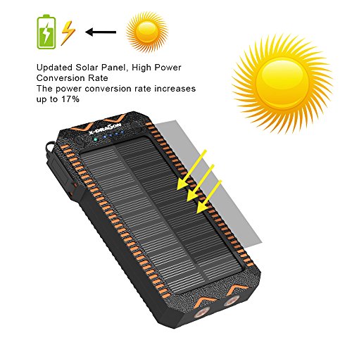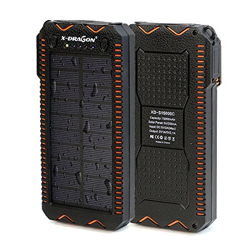 Solar Charger, X-DRAGON 15000mAh Solar Power Bank with Cigarette Lighter, 2A Input Dual Super Bright LED Light Dustproof Shockproof Dual USB Solar Panel for iPhone, Samsung Galaxy and More-Orange
