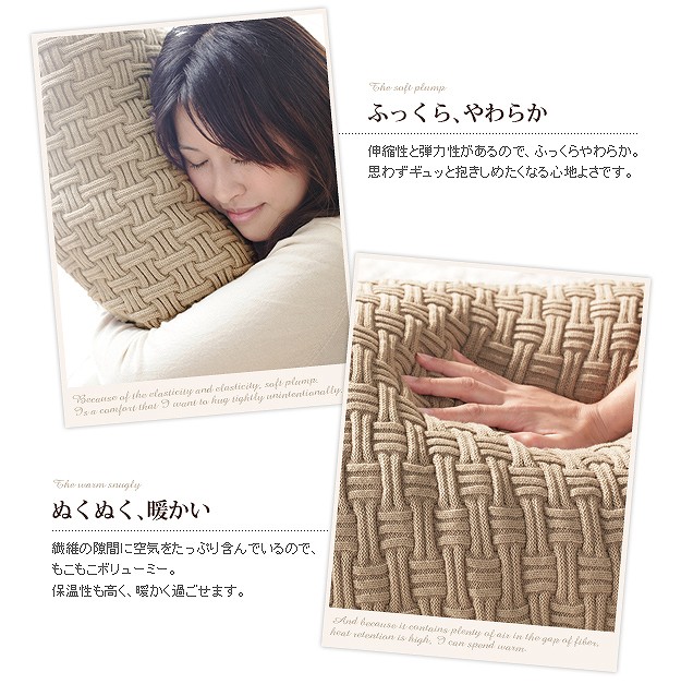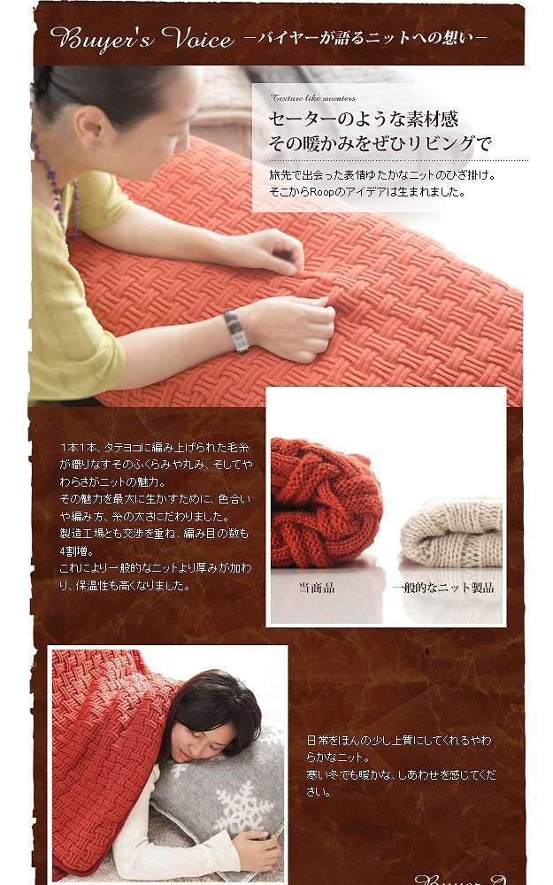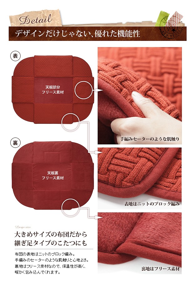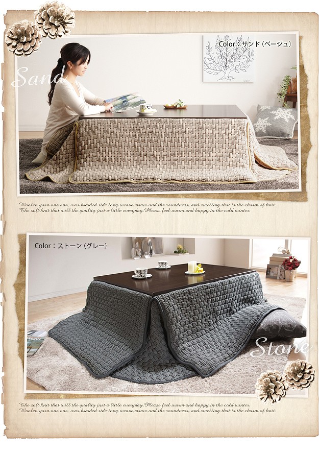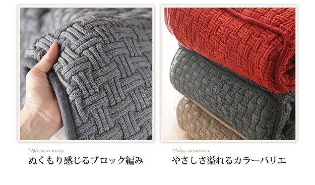 ●商品について:省スペースタイプのニットこたつ布団。ニットならではのざっくりと編まれたボリューム感と温もりある表情が魅力。表地はニットのブロック編み。色合いや編み方、糸の太さにこだわりました。手編みのセーターのような肌触りと心地良さです。裏地には保温性の高いフリース素材を使っているのでとても暖か。