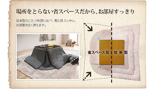 ●角のもたつきを解消した省スペースタイプの布団ですので、圧迫感のないスッキリとした印象です。