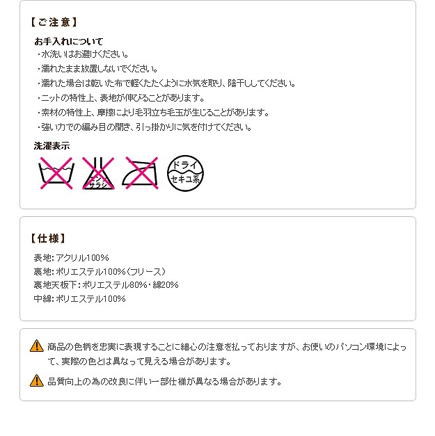●材質:表地-アクリル100%(ニット)、裏地-ポリエステル100%(フリース)、中綿-ポリエステル100%