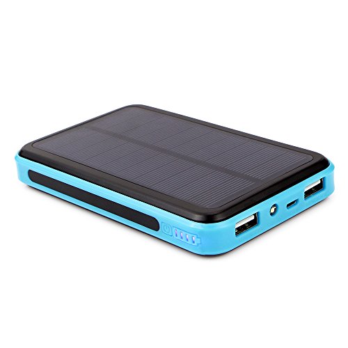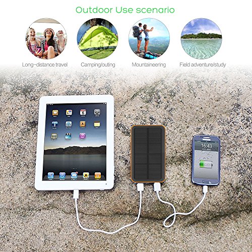 Double USB Output: (USB Output 1: 5V 1A; USB Output 2: 5V 2.1A max), charge two devices simultaneously; 4 LED lights indicates the battery status; Solar energy technology, could charge itself under sun for emergency
