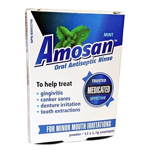 -. Feature : Amosan Oral Antiseptic Rinse helps treat: / gingivitis / canker sores / denture irritation / tooth extraction & other minor mouth irritations - w/ 68.635% Sodium Perborate Monohydrate