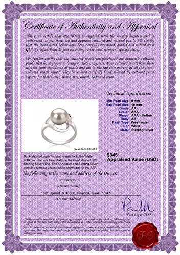 -. Feature : This designed, open work and stylized heart caresses the pearl in its center. This gorgeous white ring is created from genuine high quality freshwater pearls. Carefully grown over many years, they have been gently harvested and matched to the strictest of standards. This exquisite ring showcases one white freshwater 9.0 to 9.5mm cultured pearl. This pearl has outstanding high luster, unique button shape and lightly blemished body. / Included FREE with your pearl ring is an Appraisal Certificate prepared by a Pearl Expert describing in detail your ring pearl size, color and body shape. A color picture of your ring is shown on each certificate to ensure carefree insurance claims should those ever arise. It is a wonderful keepsake that shows you truly care. / Create a WOW! Experience with a FREE matching gift box. Our boxes are exclusively designed for PearlsOnly to gently hold your pearl ring during shipping and also to be breathtaking when you pearl ring is unwrapped and opened. With a focus on detail and elegance, the overall packaging from outside wrapping to inside, creates an unforgettable opening experience. / Easily care for your pearl ring, with FREE silky storage pouch to protect your pearl ring when you are not wearing it. Although pearls are very easy to take care off, we do include a FREE Pearl Care Card, so that you can easily know how to best take care of your pearl ring to keeps its value and beauty. / We want to be 100% satisfied with your purchase and that is why we offer 30 day returns on all of your purchases. Returns are easy and should you need to return or exchange an item, our customer care team is ready to assist you around the clock. And with a huge selection of Freshwater Pearls, Japanese Akoya Pearls, Saltwater Pearls, Tahitian Pearls and SouthSea Pearls you can find so many things to suite your taste.