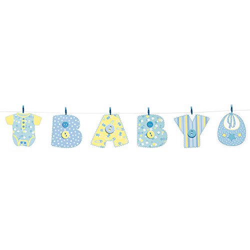 - Baby Blue Stitching Clothesline Banner features baby blanket inspired letters that spell out "Baby"