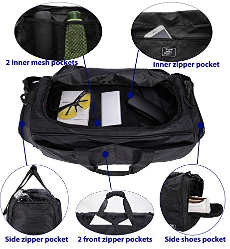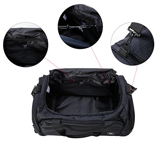 -. Feature : Carry On Size Duffel---- 21.3L*10.6W*11.8H inches, 43L, PERFECT for flight bag, workout bag, sports activity, tennis, fishing, hunting, camping, hiking and many outdoor activities / Removable Drawstring Pocket---- MIER sports duffel come with an extra drawstring pouch, can be used not only for shoes, but also for toys, accessories, clothes, toiletries, and anything you want. LARGE SIZE: 15.5 * 12.6 inches / Multifunctional Pockets---- 1 main roomy compartment to keep essentials, 2 side zippered pocket, 1 front zippered pocket, 1 removable internal shoe organizer bags, 1 inner zippered pocket handy for keeping keys and other items belongs. High quality "MIER" zipper, padded bottom / Great Design Duffel---- One side zipper pocket is ventilated and lined which you can put dirty/muddy gear in it, great for keeping items separate from the rest of your stuff, never worry to make your clothes dirty / Versatile Carrying---- Detachable & Adjustable shoulder strap with anti-slip padding and soft padded handle straps with velcro closure for more comfortable. Shoulder length: 34.6"-56.7"; Shoulder drop: 27.5"