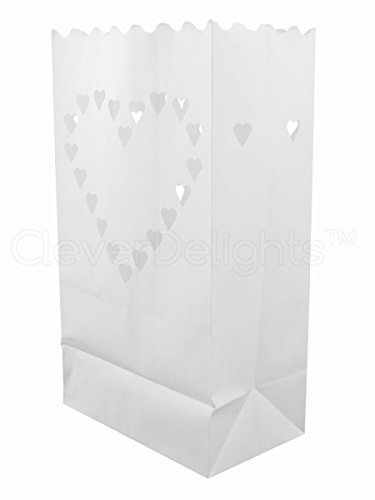 CleverDelights White Luminary Bags - 20 Count - Big Heart Design - Flame Resistant Paper - Wedding, Reception, Party and Event Decor - Luminaria Candle Bag