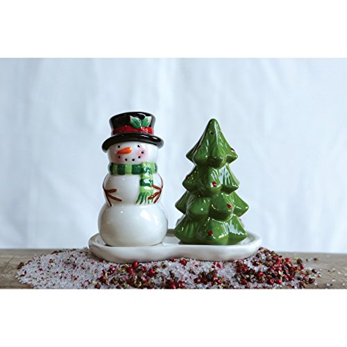 Christmas Snowman and Pine Tree Salt & Pepper Set on Tray NEW Dolomite