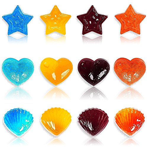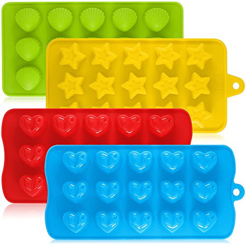 - PACKAGE CONTENT: The package includes 4 packs of candy mold - one green seashell mold, one yellow star mold, one red heart mold, and one blue heart mold.