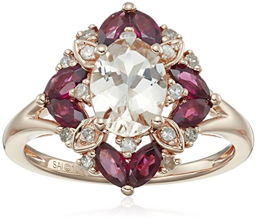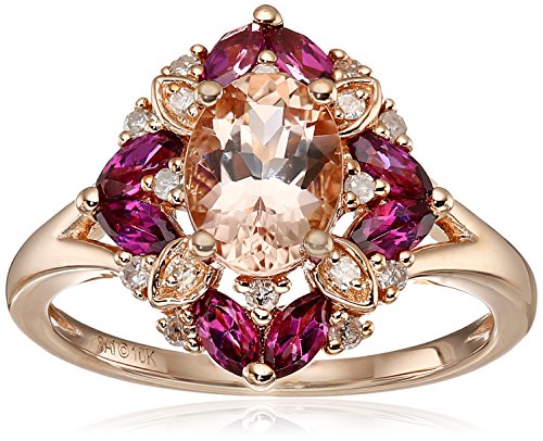 -. Title : 10k Pink Gold Morganite, Rhodolite and Diamond Cushion Ring (1/10cttw, I-J Color, I2-I3 Clarity)