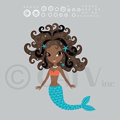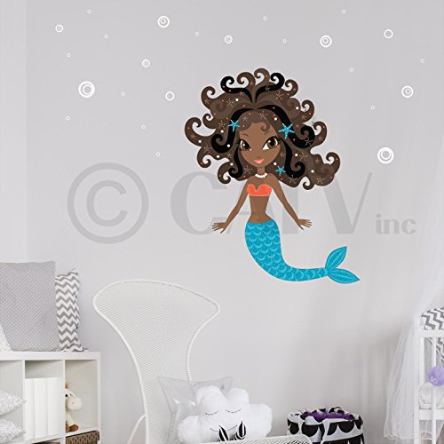Mermaid with Bubbles Self Adhesive Fabric Vinyl Wall Decal (Black Hair, Brown Eyes)