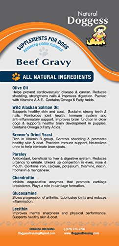 -. Feature : WHY? We make Doggess with only Natural and Healthy ingredients for people who believe their dog's quality of life is just as important as their own. / We believe in using SUSTAINABLE INGREDIENTS. Only the highest quality vegetarian glucosamine, NOT glucosamine form unknown shellfish sources. Bovine sourced chondroitin, NOT unsustainable shark cartilage. NO palm oils, NO stearic acid (limits nutrient absorption) NO Stevia (can cause diarrhea) NO sodium benzoate (mixed with Vit. C/citric or absorbic acid, converts to benzene which is HIGHLY CARCINOGENIC) / HOW? We believe in small batch productions to ensure TRUTH IN LABELING and EXCEPTIONAL QUALITY. / WHAT? 7 Key Ingredients with Vitamin C (see ingredient card image for details) that help improve hip and joint mobility, reduce shedding, improve mental sharpness and support the immune system. LIQUID FORMULA PROMOTES EXCELLENT ABSORPTION! / DELICIOUS Beef Gravy flavor in an easy pour bottle. No more stinky hands handling treats. 100% MONEY BACK GUARANTEE &10% Bulk Discount Order. PORTION OF EACH SALE IS DONATED TO ASPCA & PAWS AND STRIPES VETERANS ORGANIZATION!