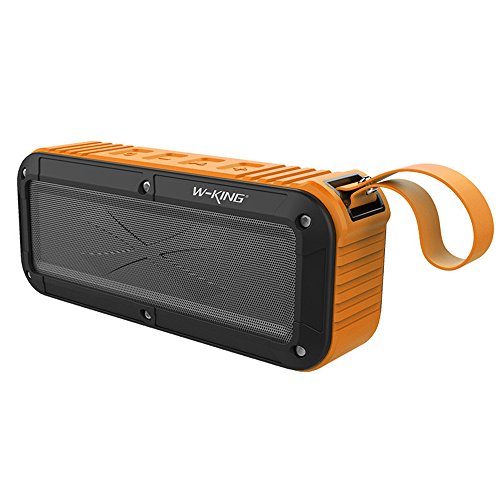 -. Feature : Outdoor and shower Bluetooth speaker features distinct mids and highs from a power efficient acoustic driver and strong bass from a specially designed passive bass radiator. Excellent sound quality, distortion-free at maximum volume and loud enough to fill very large rooms. Perfect for home, dorm room, kitchen, bathroom, car, beach, and parties; Streaming music or internet radio services. / Waterproof, Dustproof, Shockproof, and Splashproof. Portable outdoor speaker is engineered for extremely harsh environment. Rated waterproof level IPX6, it can resist low to medium pressure water splash from any angle. Not submersible but can withstand accidental drop in water. Can be used in the shower, in the rain, by the pool or on a boat. / 10 Hours of Endless Music Play. Play music from sunrise to sunset after one full charge. Built-in microphone for hands-free speakerphone calls. Your best outdoor companion for every adventure. Perfect for travel, hiking, camping, cycling, fishing and more. / Bluetooth 4.0 technology our portable speakers can pair in seconds with all types of devices with Bluetooth functions, including iPhone, iPad, iPod, Samsung smartphones, Kindle, and tablets. Play audio from laptop, PC, TV, and non-Bluetooth devices using included 3.5mm audio cable. Easy and instant NFC connection (require NFC function on devices). Play audio files from TF and micro SD card (supports mp3 and wav format). / We help you keep up with the newest, cutting-edge Bluetooth technology - but without forgetting good old FM radio! Short press POWER BUTTON exchange Bluetooth and FM mode, Long Press "+" or "-" to search for next or last station. Long Press the "->" to search for the station automatically. And press the "+" to stop it when you get to the station you need.