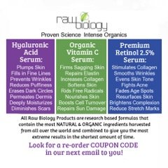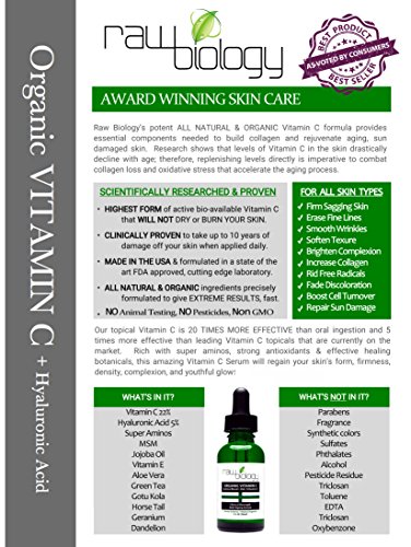 Raw biology vitamin c and e with hyaluronic acid! Get the results you have been looking for right now! Reverse the signs of aging and bring back your beautiful glow! 1. Worried about wrinkles and wondering what you can do? 2. Have years of UV and environmental damage caught up with you? 3. Still dealing with acne or starting to develop age spots or discoloration? We have the answer! With our advanced formula you can almost immediately start to see results! 1. Raw biology's vitamin C & E with hyaluronic acid formula not only nourishes your skin! It stimulates the regrowth of collagen! 2. It naturally exfoliates, replenishes moisture, promotes blood circulation, strengthens capillary walls and stimulates cell turnover and regrowth! 3. But what does this mean for you? 4. This means hydrated and healthier younger looking skin, brighter complexion with diminished lines and wrinkles, reduced pore size with fewer breakouts if any! Less visible scars and fades age spots! 5. Raw biology uses only the very best natural and organic ingredients that are researched and proven to be the most effective treatment for restoring and rejuvenating skin! Experience young looking skin and observe as the depth of fine lines & wrinkles reduce. Our advanced organic vitamin c and e serum with hyaluronic acid formula neutralizes the damaging effects of free-radicals that cause premature aging. We know you have plenty of choices when it comes to skin care products, but we want you to have only the best.Feature
