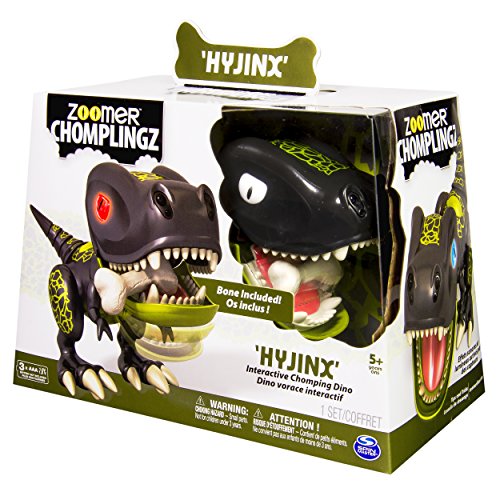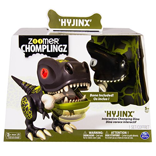 Hyjinx is the troublemaking and game playing species of Zoomer Chomplingz who’s full of bite! He lives for adventure, loves shenanigans and is always up for fun! This ‘lil mischief-maker is packed full of interactive games to play. His advanced mouth and nose sensors let him sense where you are. Try your hand at a round of Sound Warp, Hot Hands or a bone-chomping game of catch! Just toss his Bone Accessory into his mouth and watch him bite down and catch it. But watch out! It’s not always fun and games; if you pull his tail, Hyjinx will let out a dino sized fart!. Remember, he’s full of bite! Use it to your advantage as you set him up in guard mode to watch over your room. He’s a loyal ‘chompanion’ who will growl if anyone tries to touch what he’s protecting. Push, play and chomp with Hyjinx as you get into mischief with his teeth chomping action. Discover Hyjinx and Chomplingz fun you can sink your teeth into! Zoomer Chomplingz -- Full of life – full of bite!Feature
