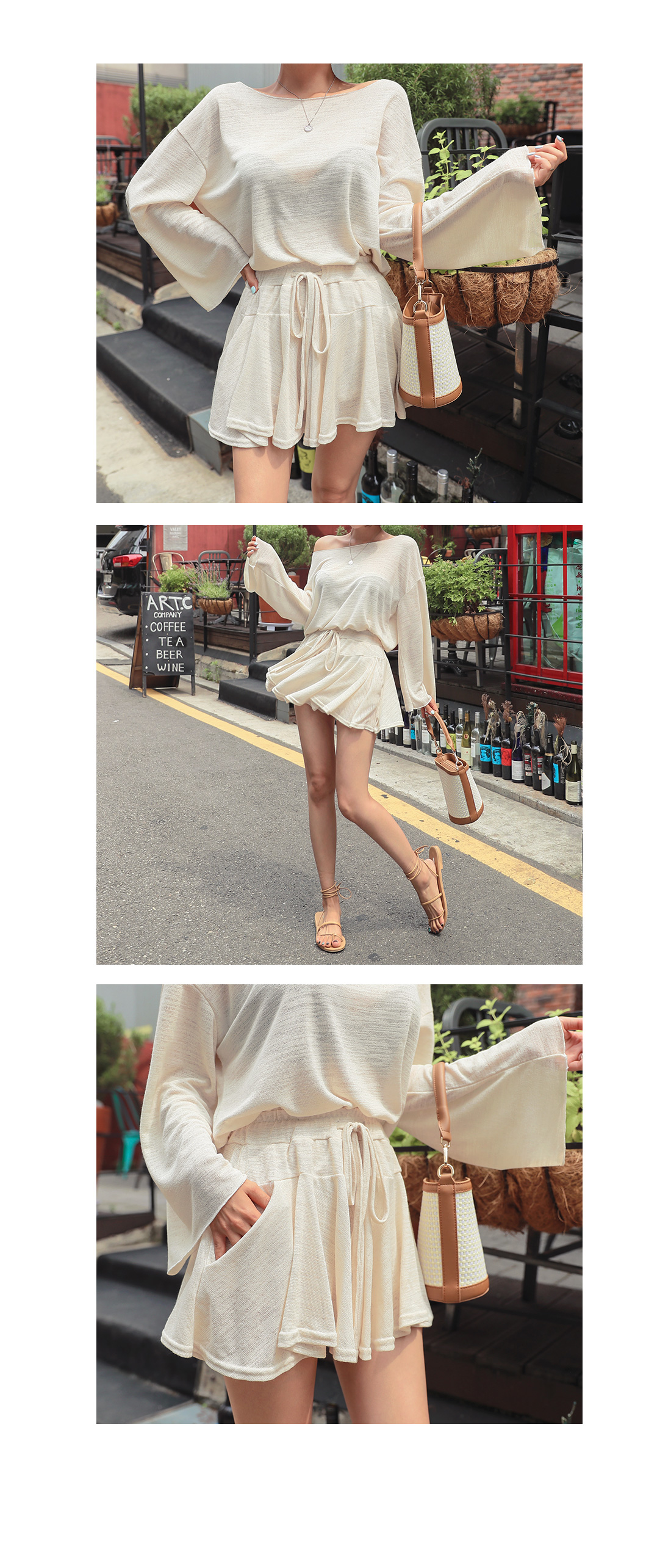 MD COMMENT 시원한 착용감으로 S/S시즌 부담없이 즐겨 입을 수 있는니트티셔츠숏팬츠 세트 아이템입니다.넓은 라운드넥이 쇄골과 목선라인을 예쁘게 보여드리구요.전체적으로 여유잇는핏의 소매를덮어주는 롱한소매길이로 입었을때 여리여리한 실루엣을 연출해줘요.팬츠는 허리밴딩으로 편하게 즐기실 수 있으며 스트링이 있어 더욱 안정감있게 착용가능하답니다.스커트처럼 보이는 A라인 치마바지로 숏한기장감으로 나와롱한 레그라인을 연출해주었으며양 사이드에 포켓으로 실용성을 챙겨주었어요. 썸머시즌엔 단독으로 초가을엔 레이어드해서착용하실 수 있는 활용도가 높은 아이템입니다.상의 하의 모두 별다른 오픈 클로징 없이 손쉽게 탈,착용 가능하답니다.컬러는 베이지,블랙,아이보리 3컬러 준비했으며모델은 베이지 컬러 착용했어요.COLOR/SIZE 베이지,블랙,아이보리FREEMODEL FITTING 베이지/FREE