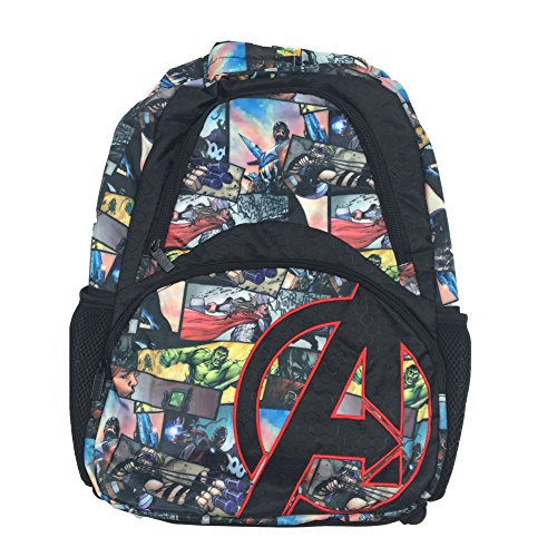 -. Brand : Marvel -. Color : Black -. Department : boys -. EAN : 0693186393471 -. Feature : Large zippered main compartment / Two smaller zippered compartments / Two mesh pouches on each side / Back Cushion for support -. ProductGroup : Apparel -. ProductTypeName : LAGE -. Size : Large -. Title : Marvel Avengers Assemble Characters Backpack -. UPC : 693186393471