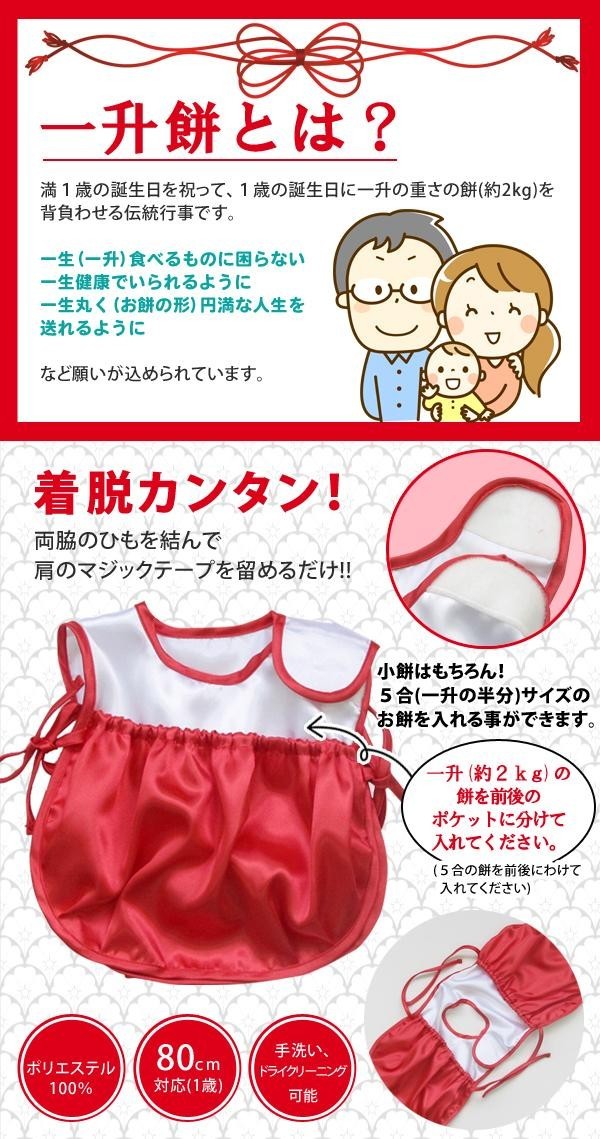 1才のお誕生日に一升のお餅を背負わせる習わしがあります。その時に使っていただける一升餅スタイです。前後にお餅を入れるポケットがついています。