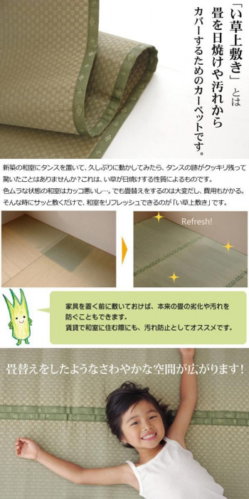 珍しい(ヘリ際のみ)市松柄の上敷きです。上敷きを敷くだけで畳のお部屋をリフレッシュ出来ます。日焼けしてしまった畳のリフレッシュに、新品の畳を汚さないためのカバーにご使用下さい。メーカー独自の技術で織機を改造し、素材の本来の色と織りだけで市松柄を表現しました。無地の上敷きでは個性がない、もっと高級感のある上敷きがほしいという方にお勧めです。 |