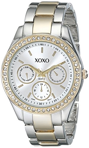 Experience the XOXO Women's Rhinestone Accent Two-Tone Bracelet Watch in all its two-tone, rhinestone-accented glory. This lovely timepiece begins with a round 38mm silver-toned metal case, a gold-toned, rhinestone-accented bezel and a textured gold-toned crown. These elements surround a pristine white dial, which is protected by a glass crystal and features gold-toned index hour markers and gold-toned hands powered by analog quartz movement. The dial also features three golden-rimmed decorative sub-dials. A silver-toned metal link bracelet with gold-toned center links straps this watch to the wrist, while a jewelry clasp ensures its secure placement. A classic combo of silver and gold tones gives this watch a transcendent presence on the wrist that you will be glad to show off.Feature