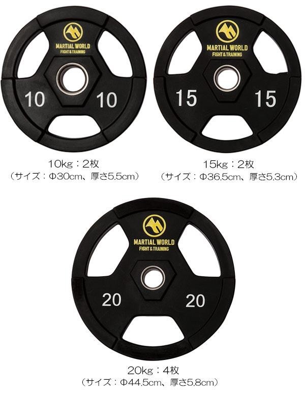 | セット内容 | オリンピックバーベルシャフト220cm(20kg)×1本、オリンピックプレート(1.25kg:4枚、2.5kg:4枚、5kg:2枚、7.5kg:2枚、10kg:2枚、15kg:2枚、20kg:4枚)、オリンピックカラー×2個 |