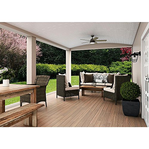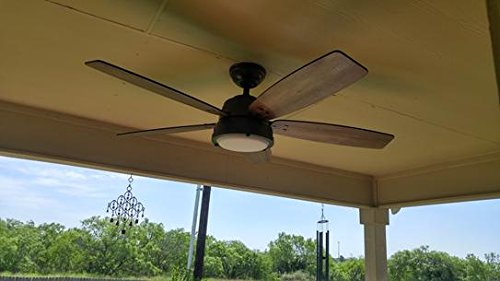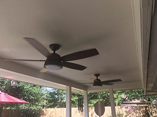 Specifications Dimensions Assembled Depth (in.): 52.00 in Assembled Height (in.): 14.00 in Assembled Width (in.): 52.00 in Ceiling Fan Width (in.): 52 Downrod Length (in.): 3 Fan Blade Length (In.): 21.5 Fan Blade Width (In.): 4.5 Details Airflow (CFM): 3045 Blade Color Family: Gray,Walnut Bulb wattage (watts): 9 Color Family: Bronze Commercial / Residential: Residential Damp/Wet Rating: Damp Downrod Included: Yes Dual Fan Heads: No Fan Blade Material: Plastic Features: Light Kit Compatible,Light Kit Compatible,Reversible Blades,Reversible Motor Fixture Color/Finish: Noble Bronze Glass Style: Contemporary Housing Color Family: Bronze Included: Angle Mount Hardware,Cap/Plug Included,Downrod Included,Hardware Included,Light Kit Included,Remote Control Included Indoor/Outdoor: Indoor/Outdoor Light Bulb Type Included: LED Light Type: Integrated Motor Speed (RPM): 151 Mounting Options: Angled,Low Ceiling Mounting,Standard Number of Blades: 5 Number of Speeds: 3 Product Weight (lb.): 23.59lb Pull Chain: No Remote Control: Yes Reverse Airflow: Yes Reversible Two-Sided Blades: Yes Timer: No Certifications and Listings: ETL ListedFeature
