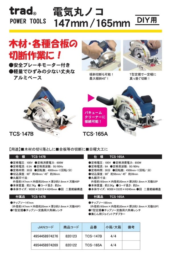 【商品名】 (業務用2個セット) TRAD 電気丸のこ/電動工具 【147mm】 TCS-147B ブルー(青) 〔DIY用品/日曜大工〕 【ジャンル・特徴】 木材・各種合板の切断作業に!安全ブレーキモーター付き電動丸鋸 ■サイズ・色違い・関連商品■147mm 1個■147mm 2個セット[当ページ]■165mm 1個■165mm 2個セット ■商品内容 【ご注意事項】・この商品は下記内容×2セットでお届けします。安全ブレーキモーター付き。軽量でひずみの少ない丈夫なアルミベース。 用途:木材の切り落としに。合板等の切断に。日曜大工に。■商品スペック●仕様 定格電圧:100V 定格電流:6.5A 定格時間:30分 定格消費電力:600W 定格周波数:50/60Hz 回転数:4000min-1(回転/分) 切込深度:90°約48mm/45°約36mm 丸鋸刃寸法:外径約147mmx内径約20mmx厚さ約1.6mmx刃数40P 本体質量:約2.7kg コード長さ:約2m 本体サイズ:W285xD215xH245mm 回:二重絶縁構造 ●付属品 チップソー147mm(外径約147mm