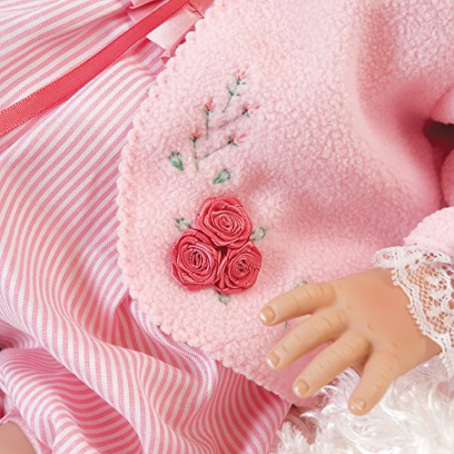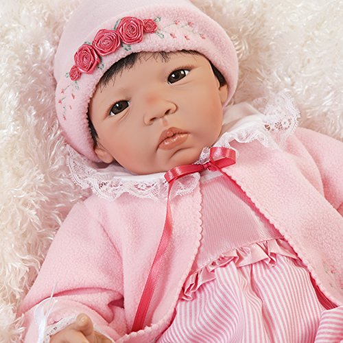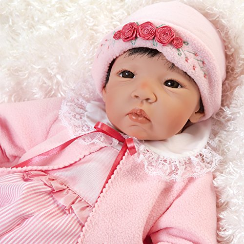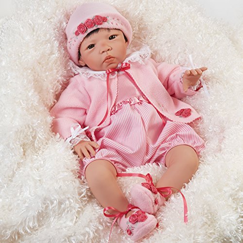 Why don't you welcome your new darling baby today? With eyes that seem to be looking earnestly at you, Nischi is clearly waiting for you! No other lifelike Asian baby doll could be as cute and healthy looking as your Nischi baby! Don't resist, bring her into the care of your warm arms and feel the incomparable bliss that comes with making your little baby happy! "Nischi" is artist Jannie DeLange's first ever baby for Paradise Galleries. She is costumed in a beautiful pink fleece jacket with full pantaloon onesie complete with matching hat and baby booties that have satin ribbon flowers and tiny pink floral embroidery details that only add to her undeniable charm! You'll fall in love with this cutie! She's the one Asian baby doll you don't want to miss! She is lovingly handcrafted from our trademarked GentleTouch Vinyl, measures 21 inches from head to toe and comes with accessories shown, a numbered Certificate of Authenticity and an exquisite collector's box.Feature