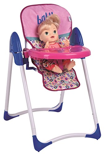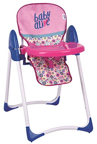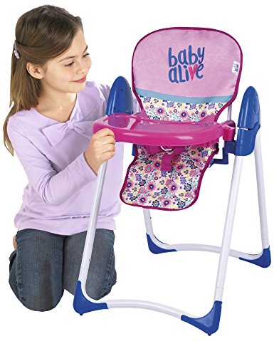 Baby alive doll deluxe highchair - feeding time! kids are sure to love feeding their favorite dolls with this adorable high chair. Looks just like a real high chair with its adjustable seat and fun feeding tray. Let their nurturing instincts take over and watch their imaginations soar! can be used with other baby dolls. Over 18" tall.Feature