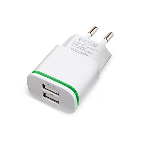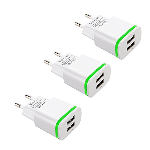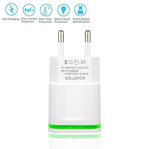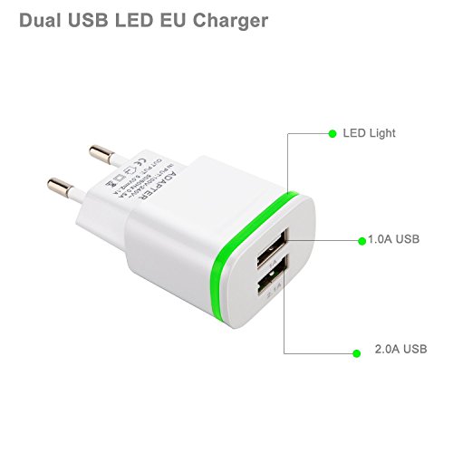 Power-7 EU Travel Charger, Max 2.1A 5V Dual European USB Wall Charger Power Adapter Charging Plug with LED Light for iPhone 6S Plus/SE/iPod/Samsung S7/S6 Edge/S5/Tablet LG G4 BLU – White – 3 Count